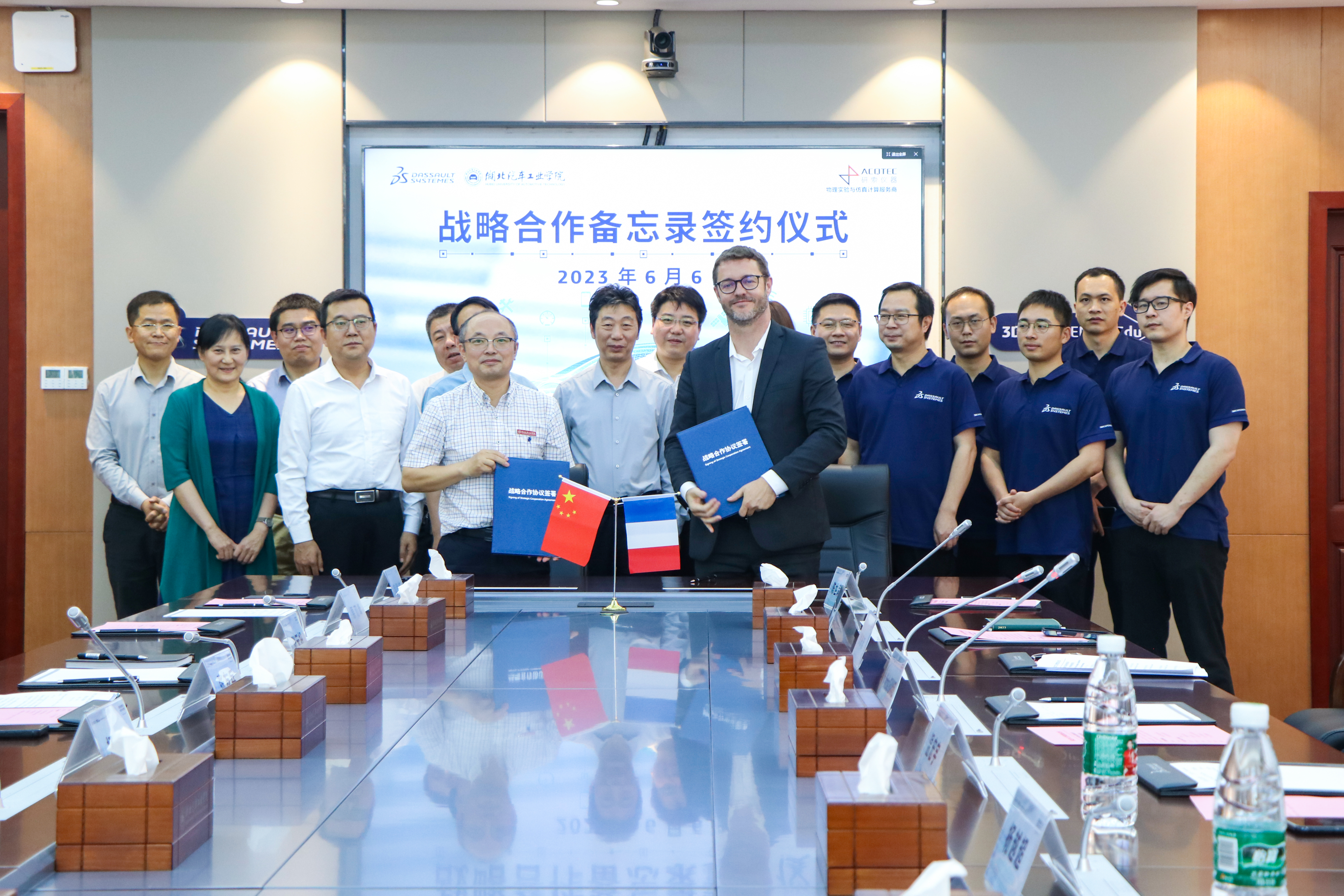 在校史馆,通过声情并茂的解说,达索公司代表了解到学校办学受国家大力支持的情况、产教融合特色路径和学科竞赛的丰硕成果。Nicolas JEANNEE在展览台中留下墨宝,为学校送上美好祝愿。