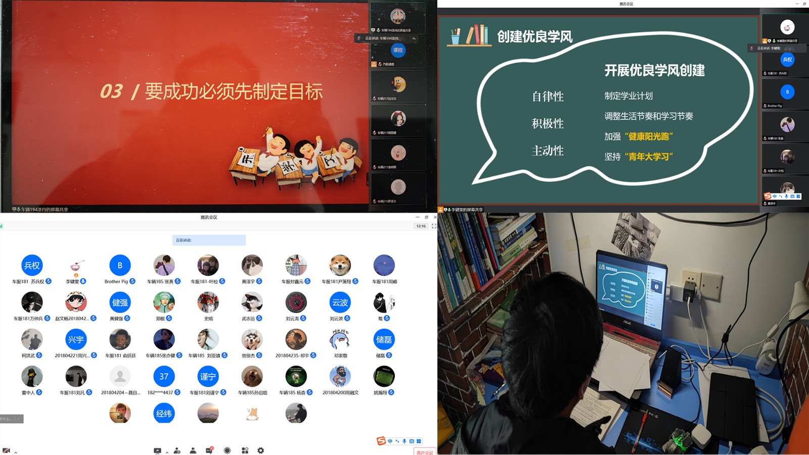 此次班(团)会以“展望新学期,加油向未来”为主题,主要内容包括五个方面:开学优良学风创建讨论、生命健康教育、心理健康教育、期初安全教育和国家安全教育。班会上,各班班主任按照学校要求并结合班级实际情况,讲述优良学风建设要点;他们对当前学生学习情况进行分析,鼓励学生制定学习计划,强调学习方法、端正学习态度、注意听课习惯等方面内容。随后,在健康与安全的教育板块,老师们积极宣传新冠疫情的防护知识,做好疫情后的心理调适,并强调要坚持健康打卡;最后以短视频等多种形式向学生们介绍了当前国家安全形势,帮助同学们树立国家安全意识。在周日“晚点名”活动上,车辆194班优秀学长漆肖以“微团课”的形式向21级学生分享了学业规划的有关经验。