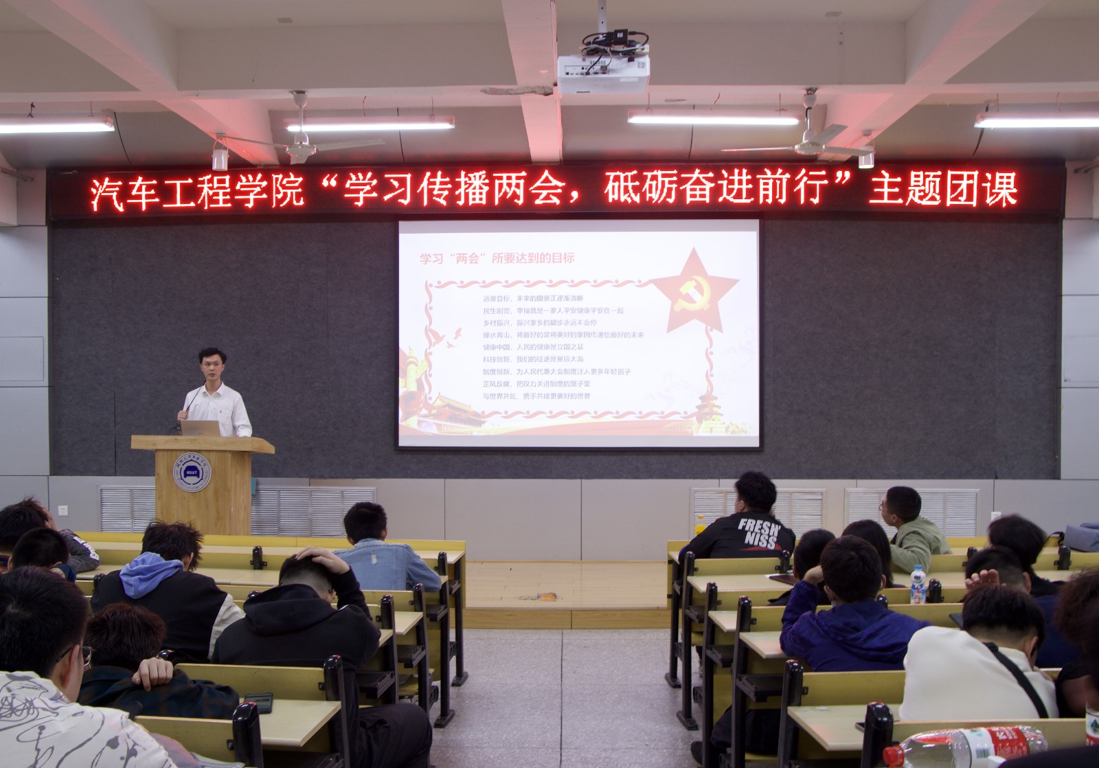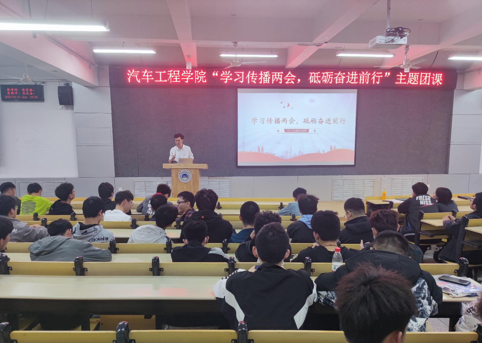 于6113教室开展“学习传播两会,砥砺奋进前行”主题团课活动,辅导员李旭、李键雯及21级全体学生参加本次活动。