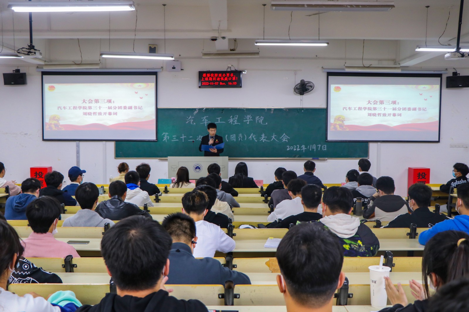 第三十二次学生(团员)代表大会在6211教室顺利召开,分党委副书记杜昕俊、分团委书记李雅琨、辅导员李键雯、李旭,校学生会执行主席覃向波以及各年级学生代表参加了本次大会。大会由车辆203班刘伯通主持。