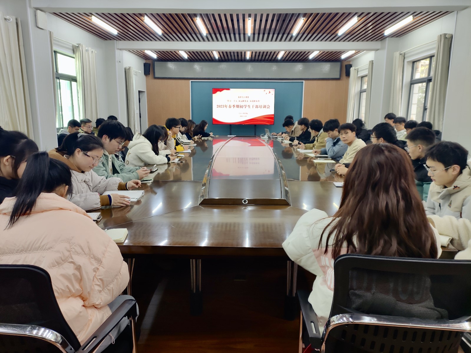 于二楼会议室举行2023年春季期初学生干部培训会,学院分团委书记李雅琨、学工办辅导员李键雯及全体学生干部参加了此次会议。会议由学生会执行主席李毅主持。