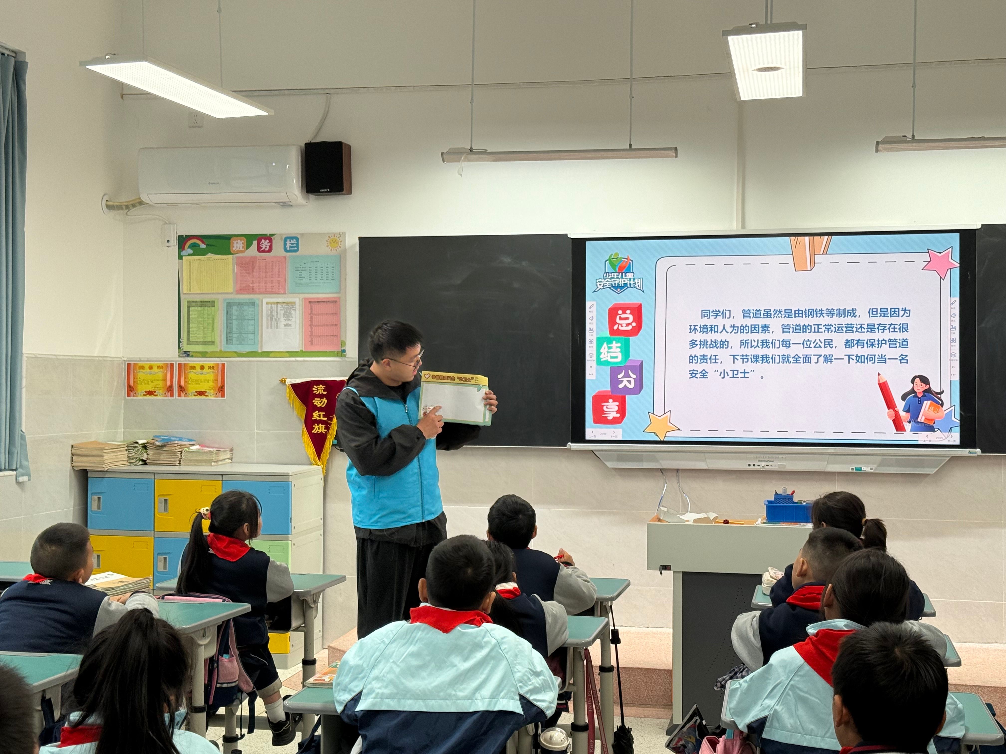 课堂上,志愿者们以能源运输动画引入话题,结合多媒体为小朋友们介绍了管道基本情况、事故应急措施等相关知识,通过一系列互动问答、热烈讨论及趣味游戏等多种方式,将原本枯燥的知识变得生动有趣,让孩子们在轻松愉快的氛围中加深了对管道保护的认识。