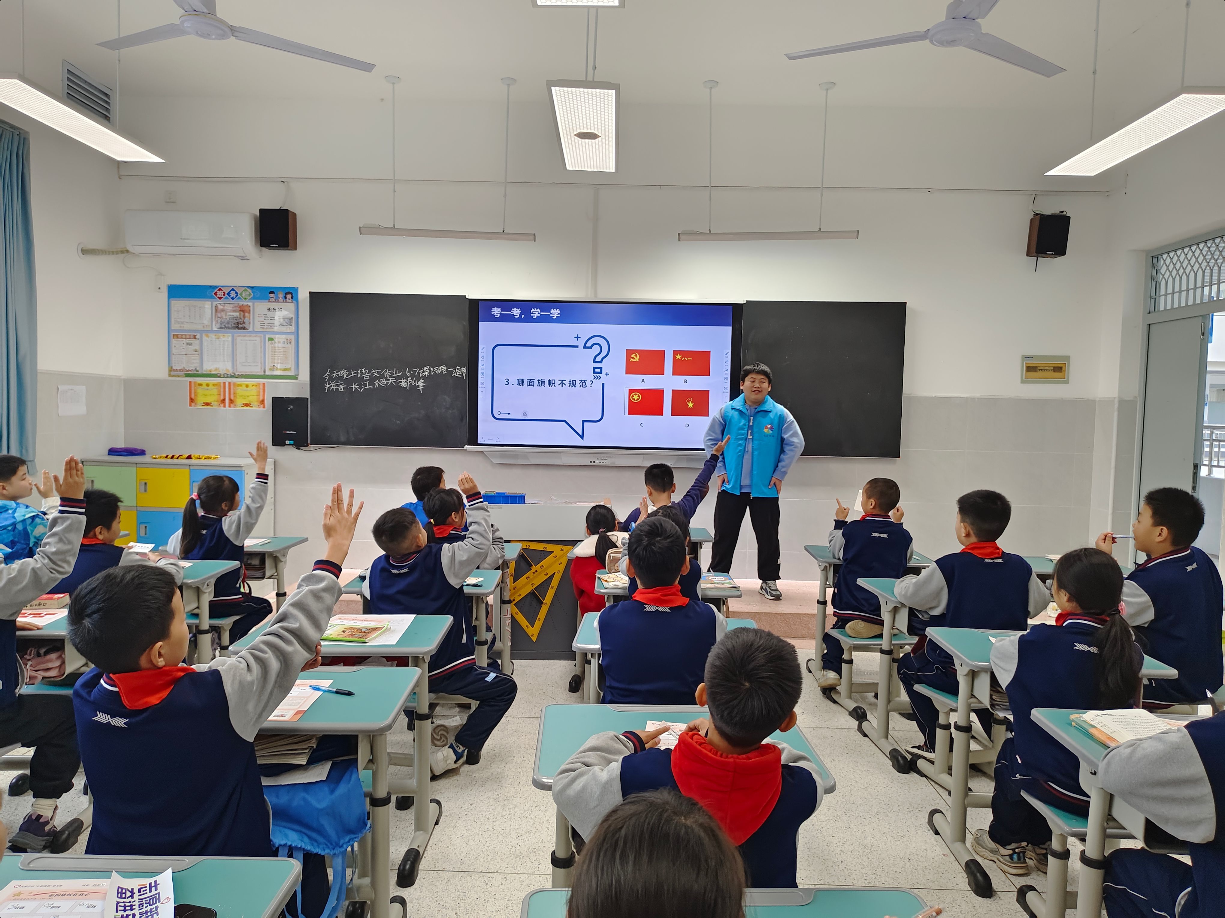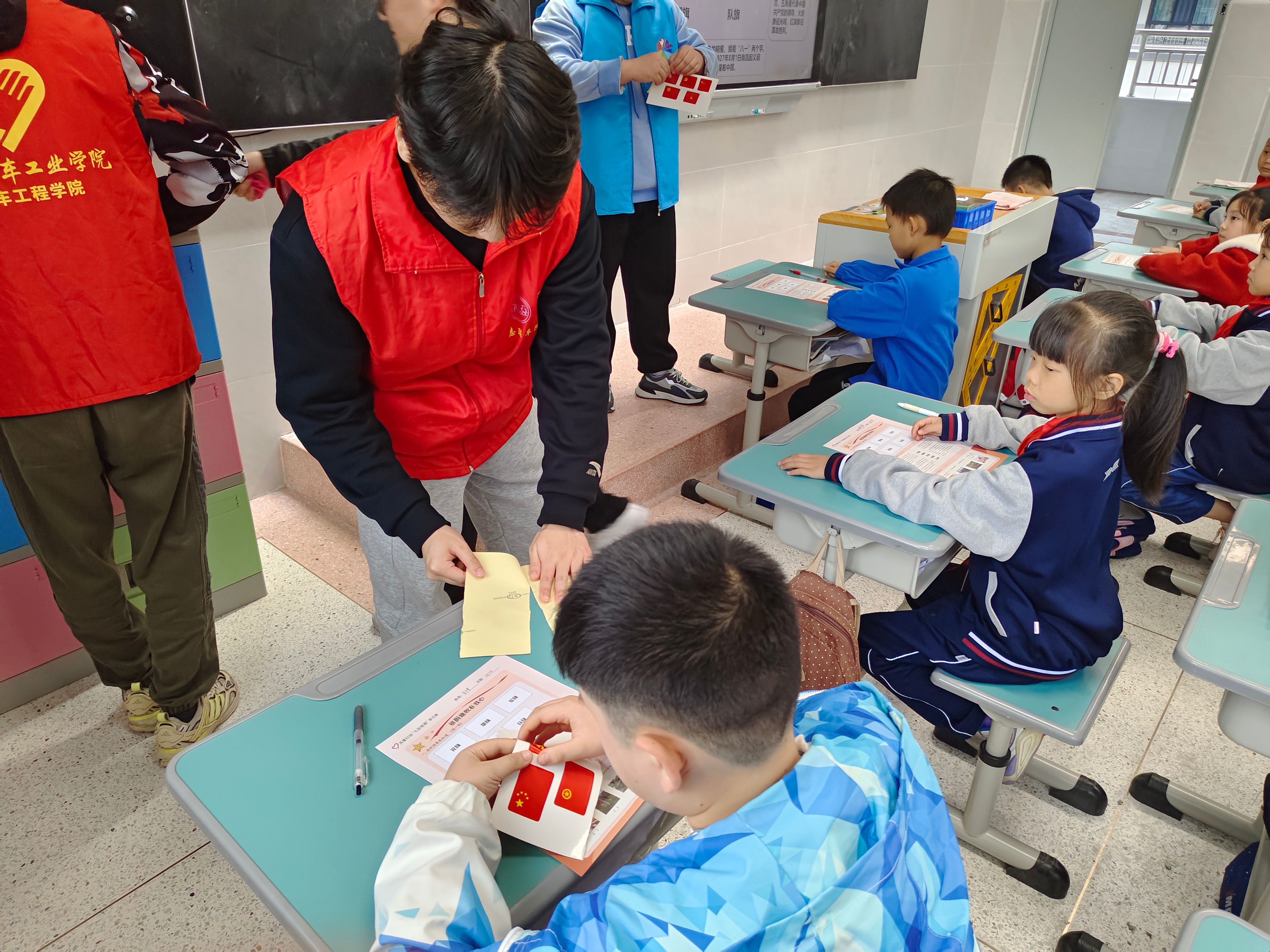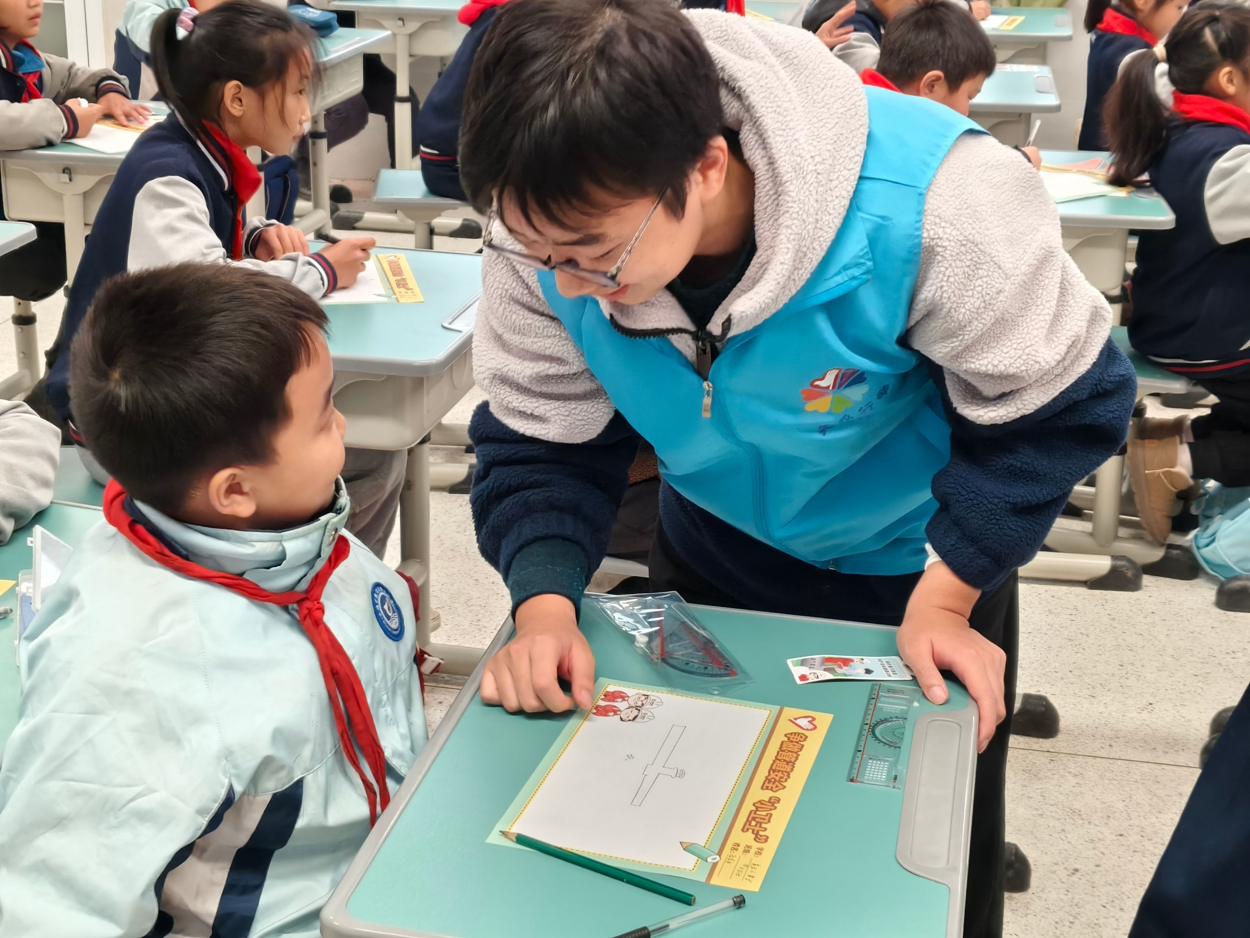 11月12日,志愿者面向4-6高年级小学生开展了以“祖国旗帜在我心”为主题的思想引领课程,通过组织学生观看祖国发展历程的纪录片,引导学生亲手制作国旗国徽模型等方式,深化孩子们的爱国情怀。