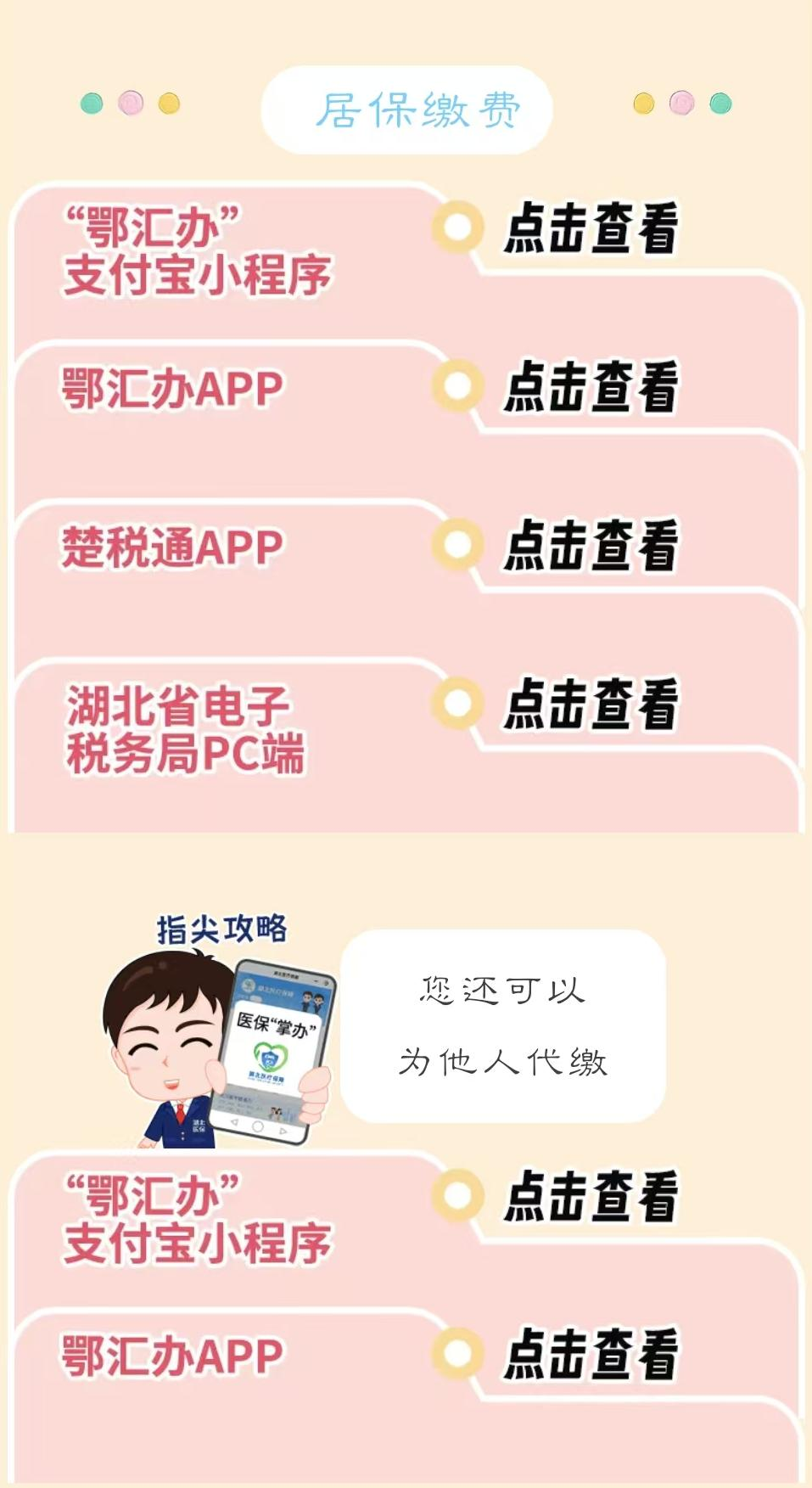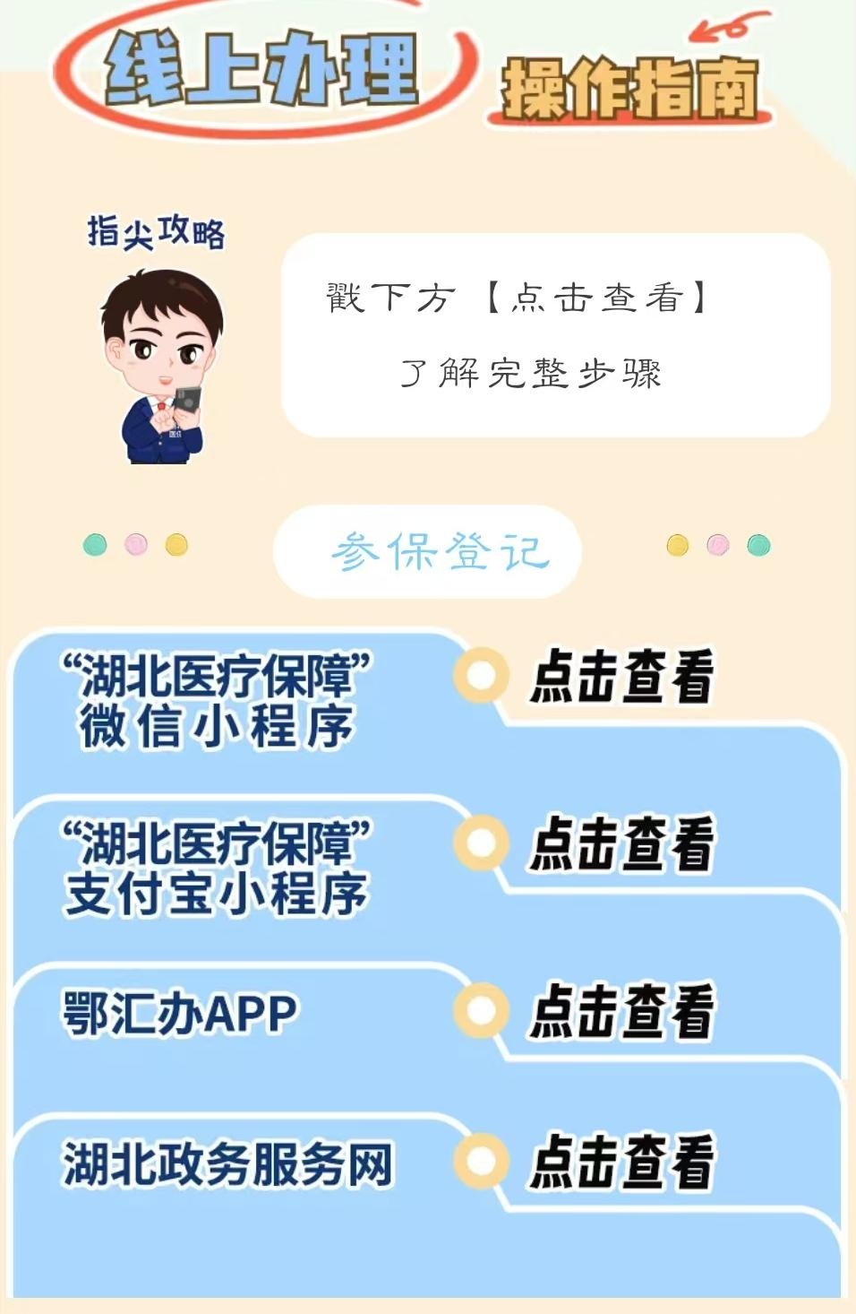 (1)2025年度城乡居民基本医疗保险集中参保缴费时间2025年10月-2026年2月,保险费用一年一缴,保障时间为2026年1月1日-12月31日,入学新生办理完参保登记后可自行在湖北医疗保障微信小程序、鄂汇办APP等渠道缴纳2026年城乡居民基本医疗保险。2026年城乡居民医保个人缴费标准为400元/人每年,具体操作流程可参考微信公众号“湖北医疗保障”推文《@湖北人,城乡居民医保缴费开始啦》;
