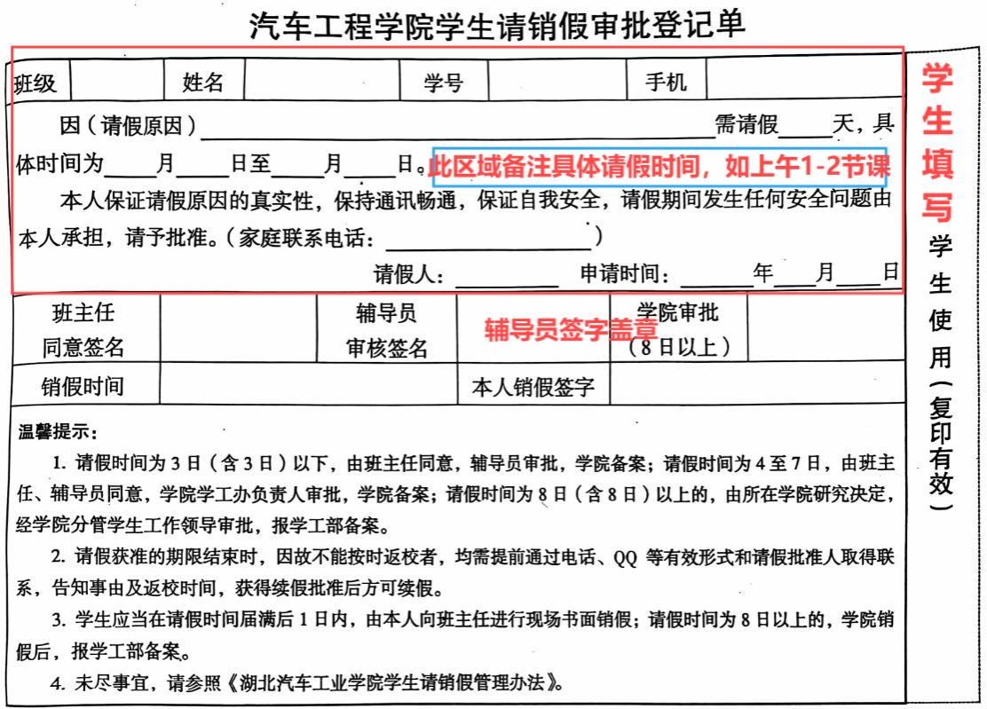 (1)不需要离校过夜时,需在学工办开具纸质版请假条如下图,学生如实填写相关信息,辅导员审核签字盖章有效;