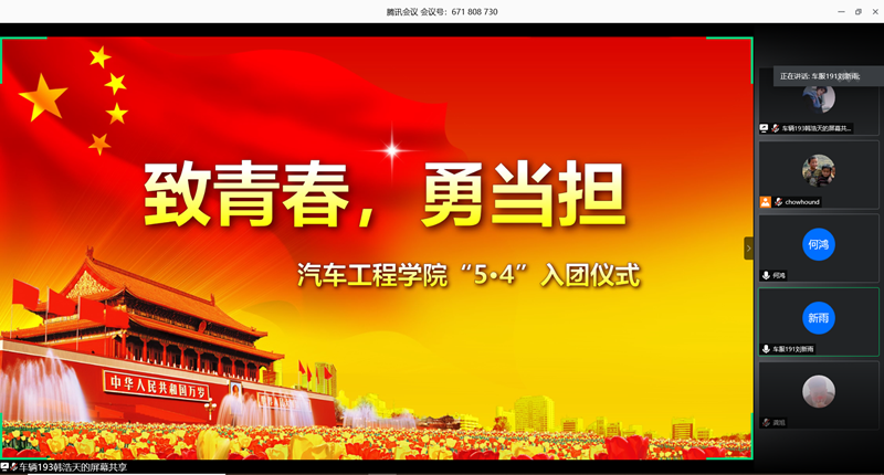 最后,胡霄寒老师进行总结发言,她对19级新团员的加入表示由衷祝贺,同时也提出了要求,“加入团组织是人生的新起点,希望同学们不仅在形式上入团,更要在思想上入团,今后要更加严格要求自己,严格遵守团章,履行团员义务,发挥模范带头作用。车院的近千名团员、三十多个团支部共同构成了有力量、有希望的共青团组织,我们相信青年力量必将不断飞跃。”