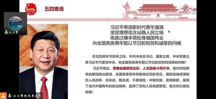 会上,王方勇首先带领大家回顾了五四运动的精神及其重要历史意义,通过屏幕共享和同学们一起观看了“满腔热血仍是少年”五四微电影,并学习了习近平总书记在五四青年节对新时代青年的寄语。在感悟分享环节大家各抒己见发表了自己对总书记对新时代青年寄语中说的“青春由磨砺而出彩,人生因奋斗而升华”的见解,阐述自己对青春、对奋斗的理解。思政部部长杜新宇说到,青年学子需深切缅怀五四先驱崇高的爱国情怀和革命精神,补充科学文化知识,提升思想道德品行,坚定理想信念不动摇。权益部部长张顺雨说,在决胜全面小康、决战脱贫攻坚的收官之年,在实现“两个一百年”奋斗目标的历史交汇之年,我们车院青年要树理想、爱祖国、担责任、勇奋斗、练本领、修品德,奋勇直前。