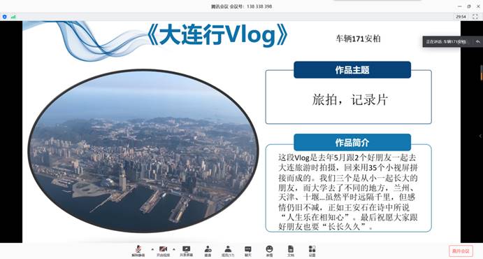 活动从4月上旬开始到,整体分为三个阶段进行。初赛阶段,通过网络投票方式从征集到的60多个视频作品中评选出10个作品进入决赛。决赛环节,选手们通过QQ课堂用3-5分钟时间结合PPT将创作作品的主题与内容、剪辑手法、创意点呈现给评委。最后,在综合评委的评分表决下,车服191班安婷同学的《回归的信念》凭借着唯美的古风形象和动人的故事情节征服全场荣获比赛一等奖。而其他作品也都是用心之作,车服171安柏同学的《大连行vlog》按照时间顺序,从多个角度分享了自己在大连的旅程,表达了“读万卷书、行万路路,每一次旅行都是人生的成长”的感怀;车辆192班张嘉瑞同学的《潼》分享了家乡的风光和日落美景,镜头中都是家乡无法忘却的一草一木,人与自然和谐相处之美感油然而生。在第三个阶段,探花精选