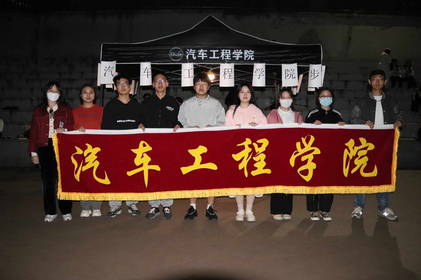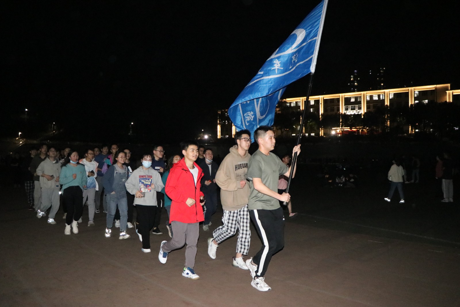 在田径场灯光的照射中,每位同学脸上洋溢着青春活力,迈着矫健的步伐在跑道上奔跑,大家不以竞技为目的,合理调整自身状态,以锻炼体魄为目标进行健康跑。此次活动在学院的统一组织下,车院师生热烈响应、积极参与。学工办李旭和邱天宇老师带领学生党员与学生会干部列队奔跑,发挥先锋模范作用,他们步伐整齐,手持院旗,在田径场勾勒出青春活力的弧线。