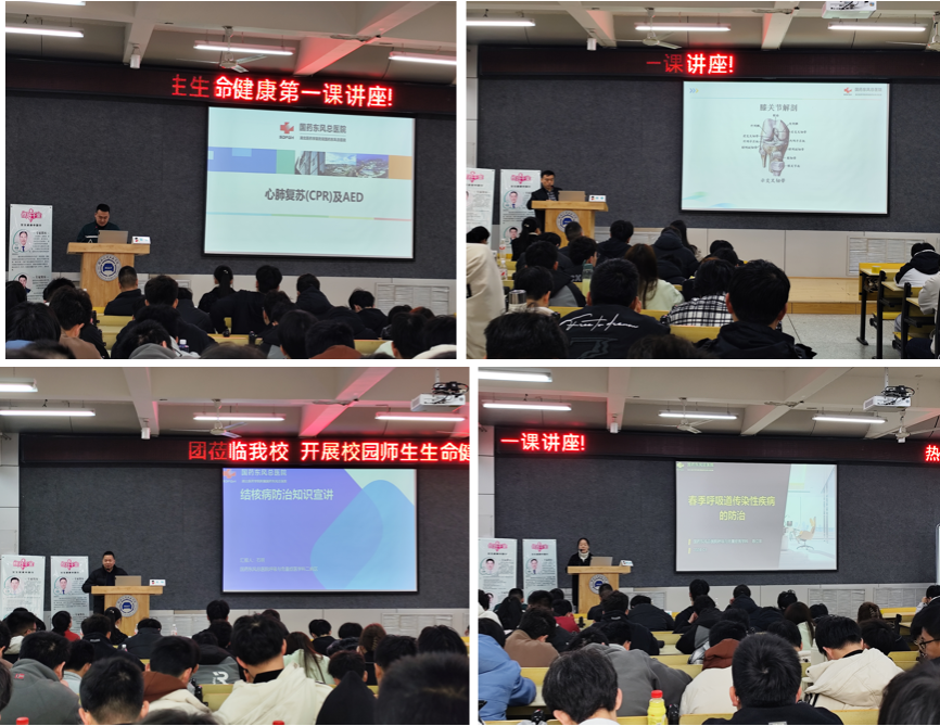 讲座中,张俊主任围绕青年运动中的急慢性损伤展开,用通俗易懂的话语,辅以图文并茂的PPT,展示运动的膝关节及半月板,使学生们更加清楚如何正确运动,减少不必要的运动负荷;石明主任就结核病定义,分类,表现,预防及治疗等方面进行了宣讲,学生们对结核病有了新的认识;陈立彩医生讲解了春季呼吸道传染性疾病的防治,主要从个人,家庭,社区,医院四个维度对传染病进行部署与防护;妇产科副主任耿杨柳医师生动形象地进行知艾、防艾、关艾的公益宣讲,从艾滋病的特点、传播途径、临床表现、预防措施等方面进行了详细讲解;张医生现场教学成人心肺复苏术,并指导AED操作方法,现场气氛活跃,学生们踊跃参与并互动。