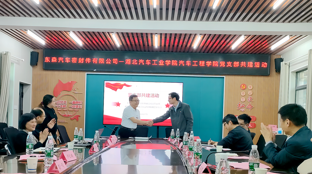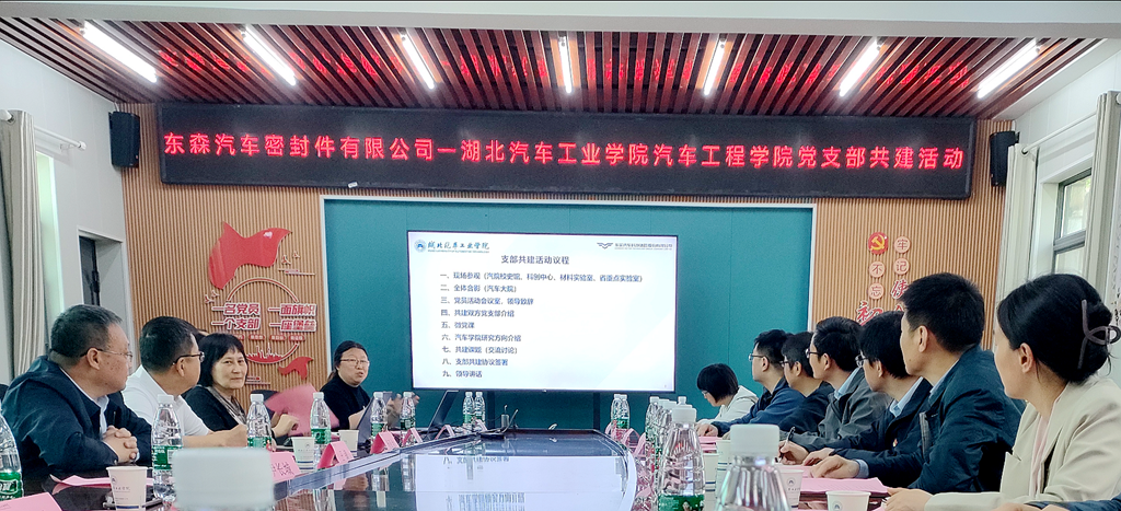 党员活动会议室开展了校企支部共建活动。东实汽车科技集团股份有限公司董事长助理赵炀,十堰东森汽车密封件有限公司党委书记向著斌、副总经理肖磊、行政部部长陈慧、技术中心副主任陶宜勇,探花精选