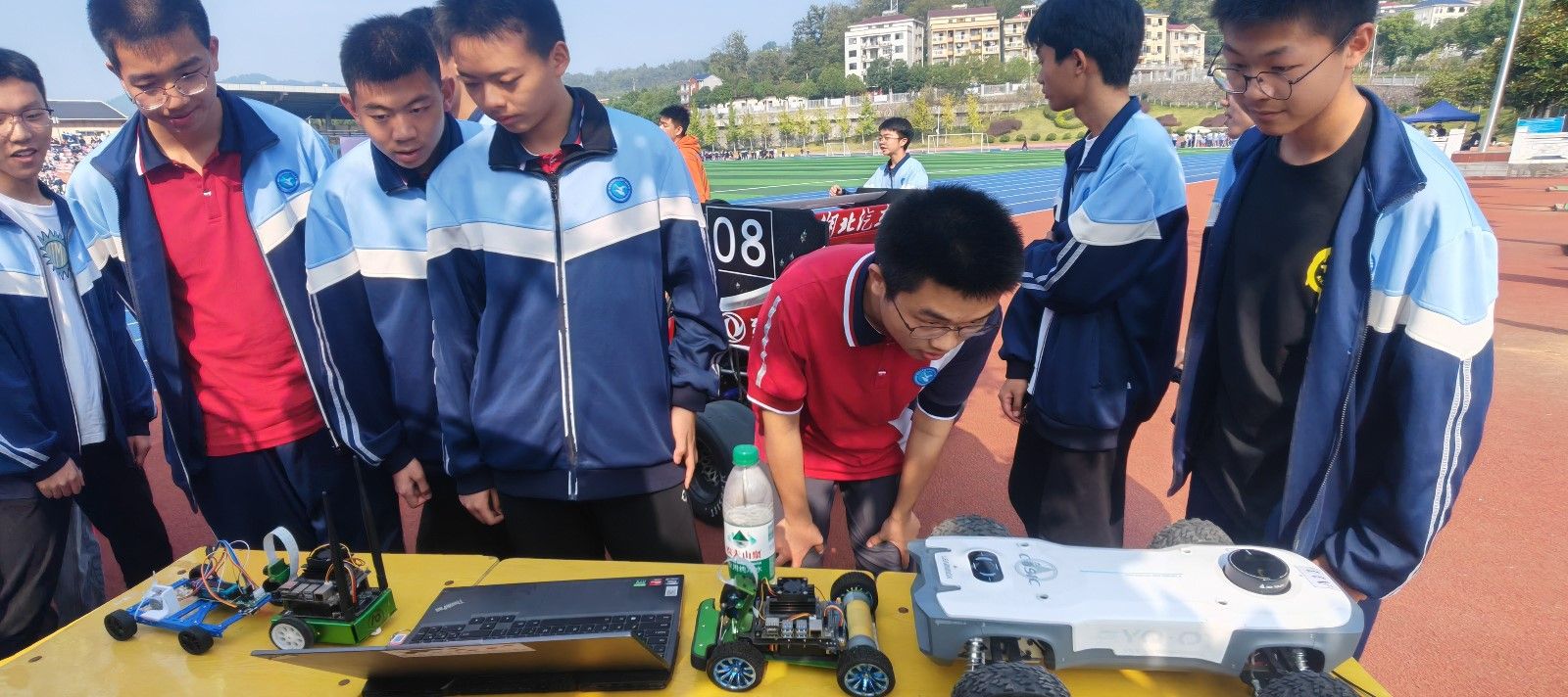 除了方程式赛车,周彬一行还携带了由学院学生制作的往复小车、JetBot Al Kit人工智能机器车、JetRacer人工智能小车,以及由学生改装的曾获得中国机器人及人工智能大赛全国总决赛一等奖航天·轻舟机器人,几辆小车一字摆开,吸引众多学生驻足问询。