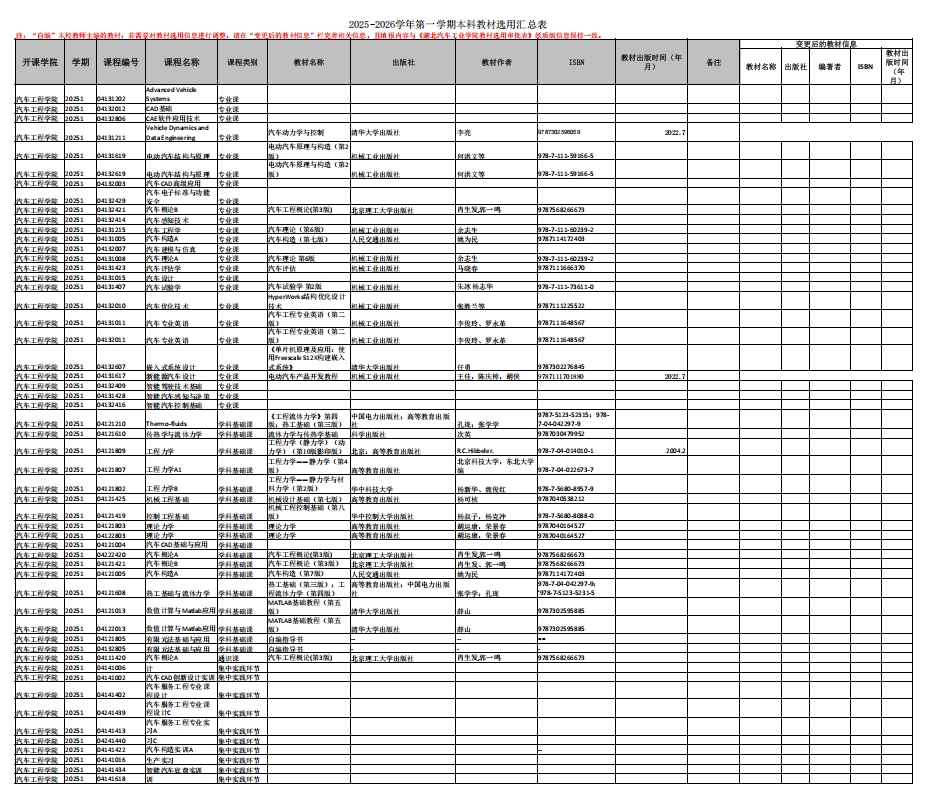 2025-2026学年第一学期本科教材选用汇总表