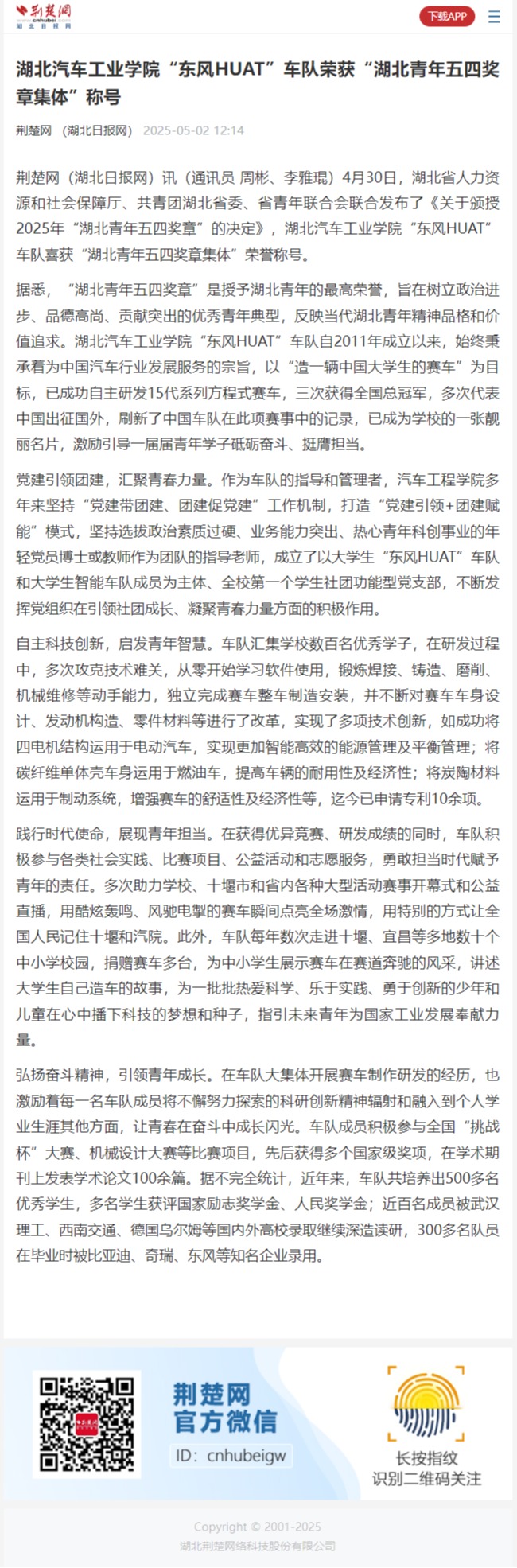 【荆楚网】探花精选 “东风HUAT”车队荣获“湖北青年五四奖章集体”称号