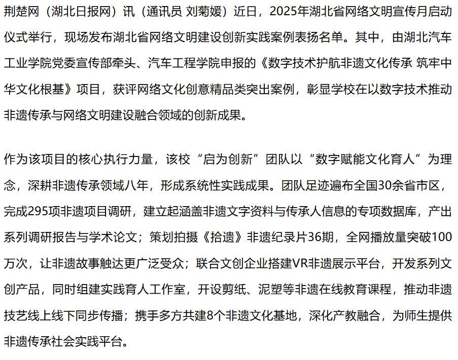 【荆楚网】数字护航非遗!探花精选 项目入选省级网络文明建设创新案例