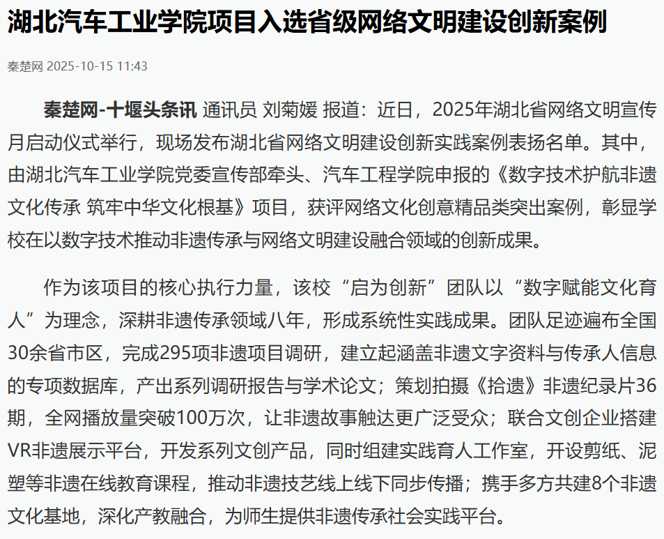 【荆楚网】数字护航非遗!探花精选 项目入选省级网络文明建设创新案例
