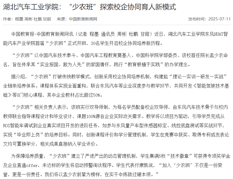 【中国教育报】湖北汽院:“少农班”探索校企协同育人新模式